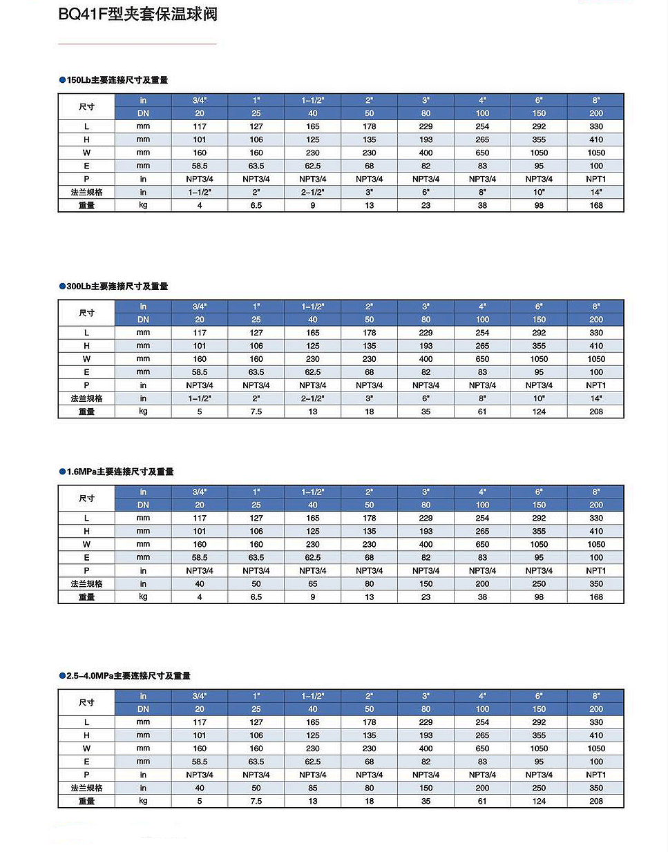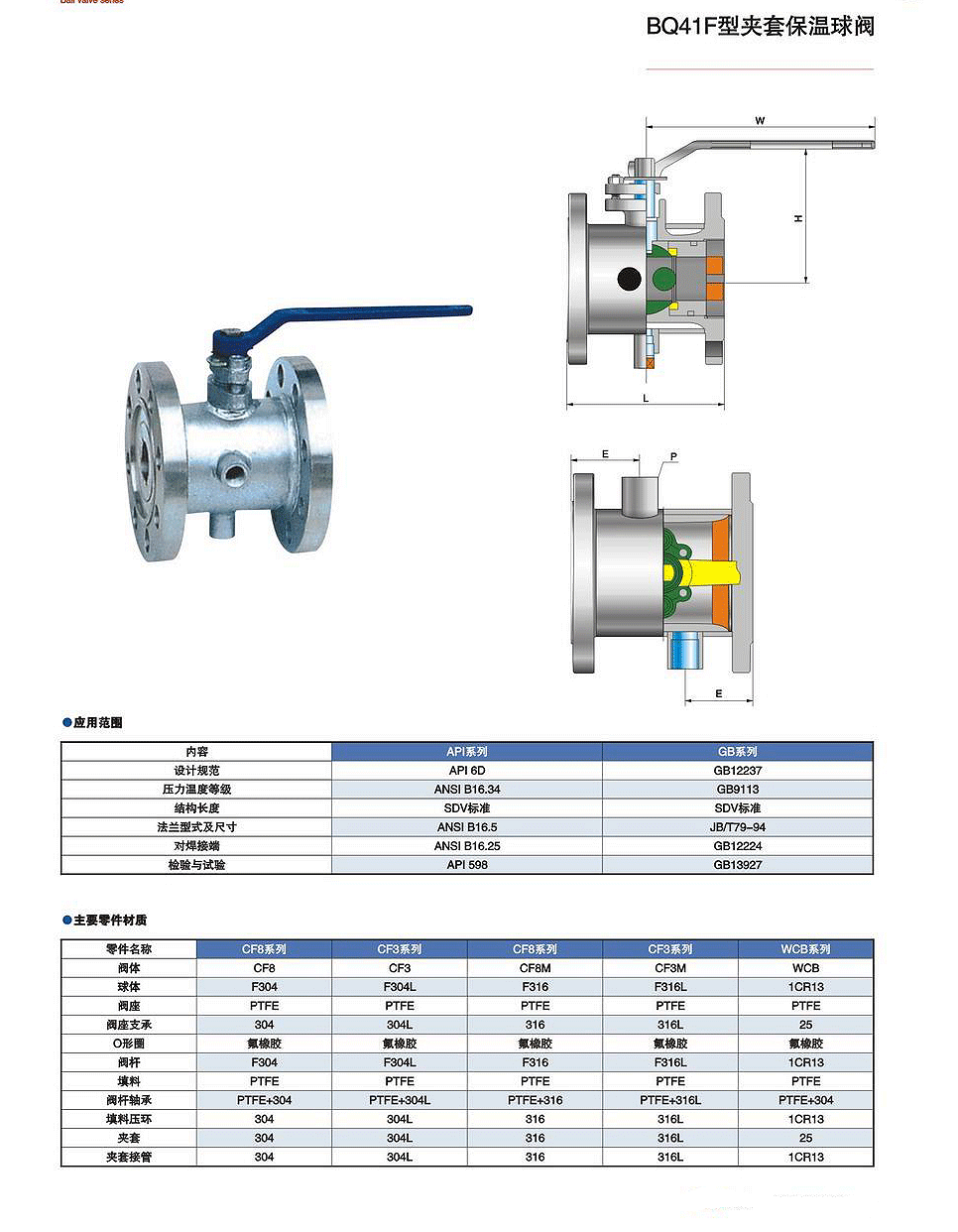 BQ41F型保温球阀具有良好的保温保冷特性,且阀门的通径与管径一致,同时又能有效降低管路中介质热量损失。主要用于石油、化工、冶金、制药、食品等各类系统中,以输送常温下会凝固的高粘度介质。由于采用整体式结构,因而BQ41F球阀比一般球阀更小,重量更轻,且无外漏,密封性能良好,夹套采用碳素钢管焊接比铸造的更加耐压牢固。