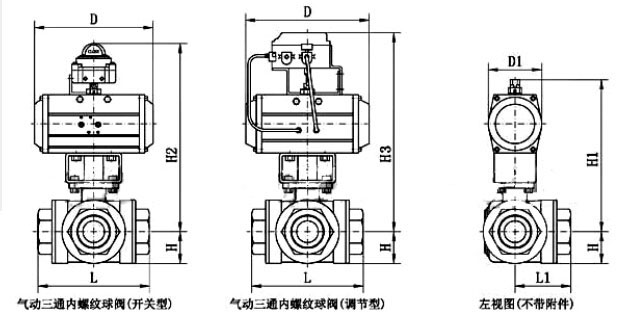 气动三通内螺纹球阀是综合国内外先进技术而开发的新型三通切换型调节/切断阀门。标准球芯有L型三通双通道,改变球芯与管道的相对角度,可以对三支管道流体实现不同的组合控制;T型气动三通内螺纹球阀可起配比作用,适用于液休、气体、蒸汽等介质的配比调节与控制。气动三通内螺纹球阀由气动活塞式双作用或单作用(弹簧复位式)执行机构组成,有比例调节型(采用电-气阀门定位器,以电信号和压缩空气为动力,接受控制系统输入的0-10mA DC或4-20mA DC电流信号,改变球芯的旋转角度,可实现比例调节动作)。二位切换型(采用电磁换向阀、阀位回讯器,以AC220V或DC24V电源电压和压缩空气作动力,实现对流体介质的快速切换控制)。